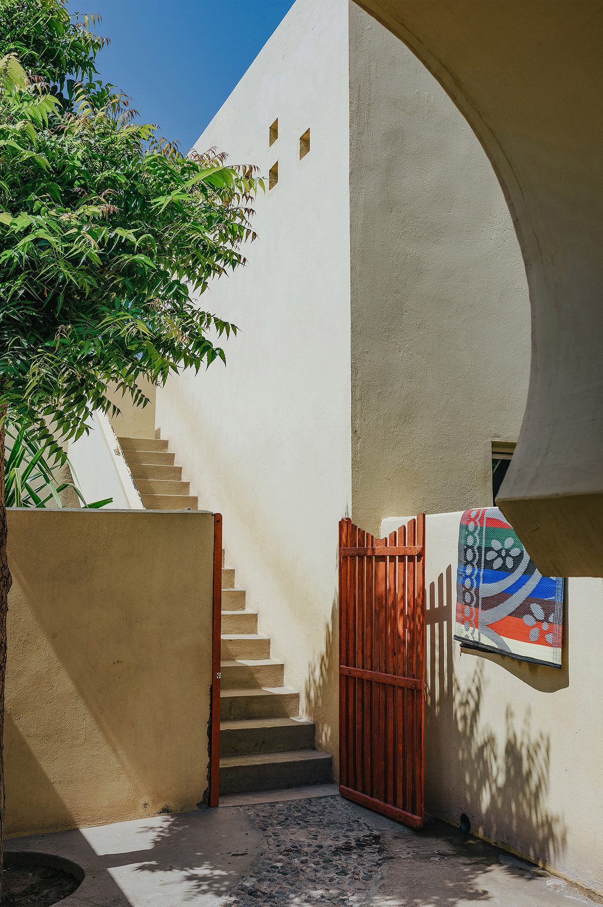 Because the local people were traditionally nomadic herders and lived in broad open spaces such as the desert, the sand color chosen for the walls and the openings between the different spaces echo this lifestyle. Only the bedrooms have doors.